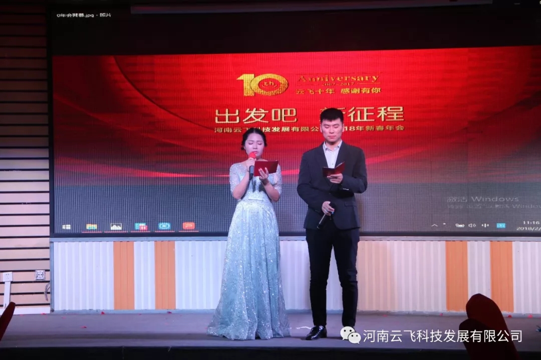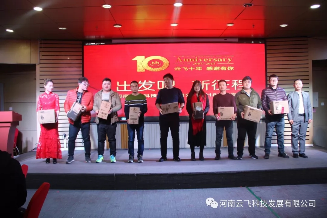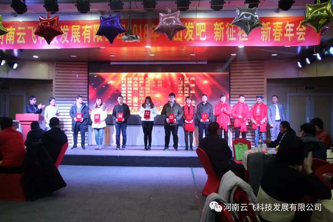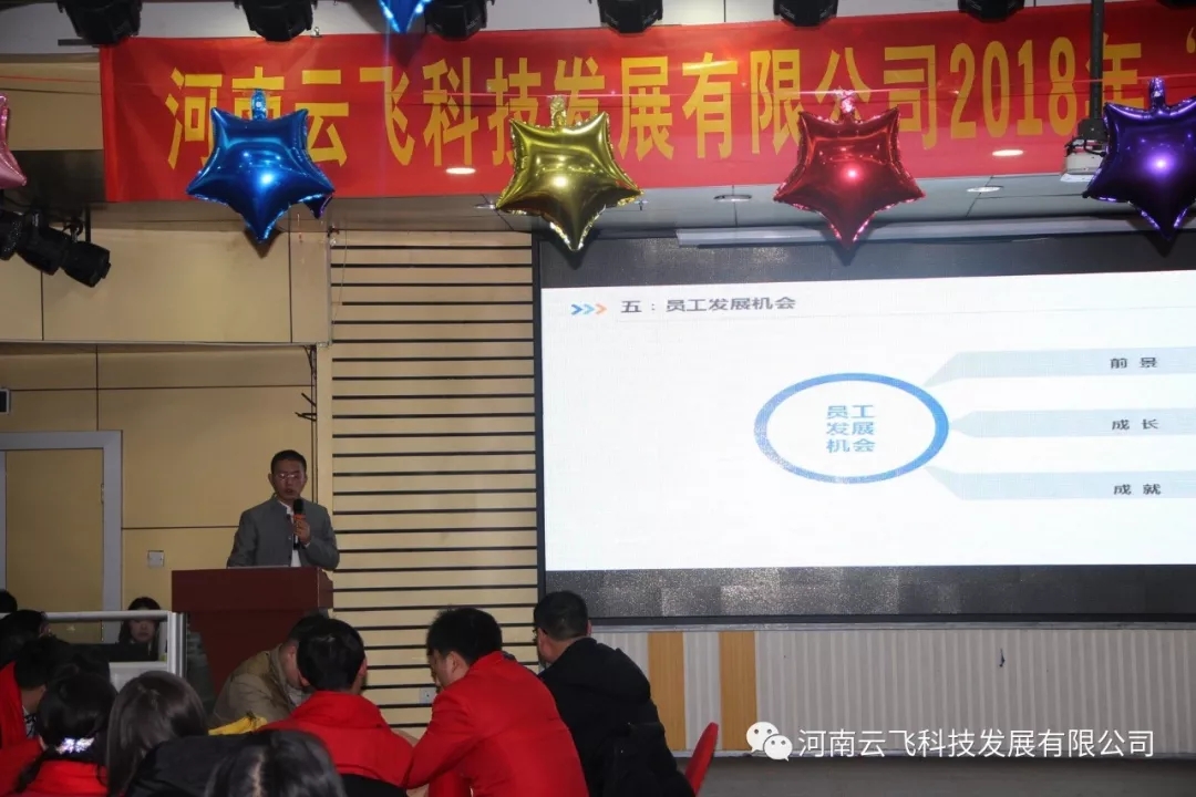开场舞结束后,在一片热烈掌声中,河南云飞科技发展有限公司总经理周国涛先生登台致年会贺词,拉开了2018年会的帷幕。周总首先向公司全体员工及现场嘉宾朋友送上了诚挚的关怀和问候,并与大家一同回顾了云飞在2017年里取得的一系列重大成就与进步,同时响应今年年会的主题:“出发吧,新征程”,对云飞的未来十年提出了新的目标与愿景。
