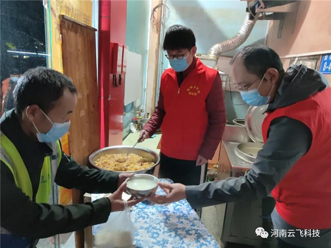 虽是简简单单的一碗粥、一碟菜、两个馒头,却感动着每一位叔叔阿姨……而每位叔叔阿姨充满真挚的眼神和一声声感恩的道谢,更让身穿红马甲的云飞人干劲十足!“爱心送早餐,用爱传温暖”云飞人用热心服务,希望这个寒冷的清晨透过一缕阳光,温暖每一位环卫工人的心。