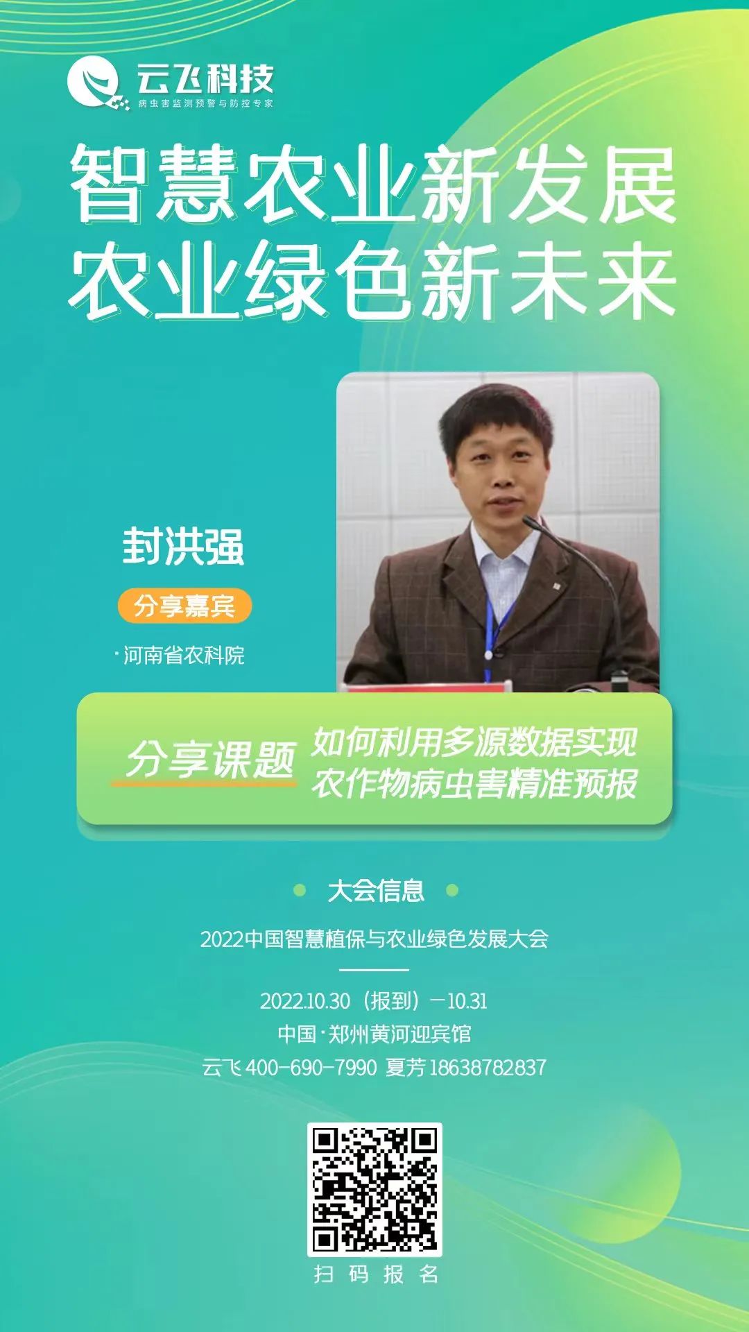 2022中国智慧植保与农业绿色大会将于2022年10月30日(报到)——10月31日,在郑州黄河迎宾馆盛大召开,河南省农科院封洪强受邀出席。