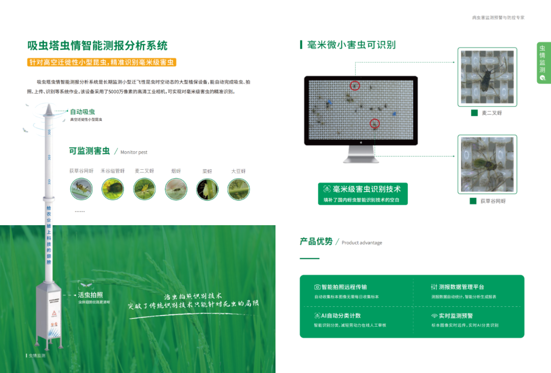智能吸虫塔虫情测报分析系统是一种用于监测和预警小型迁飞性昆虫的大型植保设备,是传统吸虫塔的升级版。通过对传统吸虫塔硬件结构进行改进升级,设计发明了昆虫标本转移结构,同时集成超高清5000W工业相机,实现吸虫塔下小型昆虫图像的自动化采集、智能识别计数,拍照后,标本的自动收集、保存。