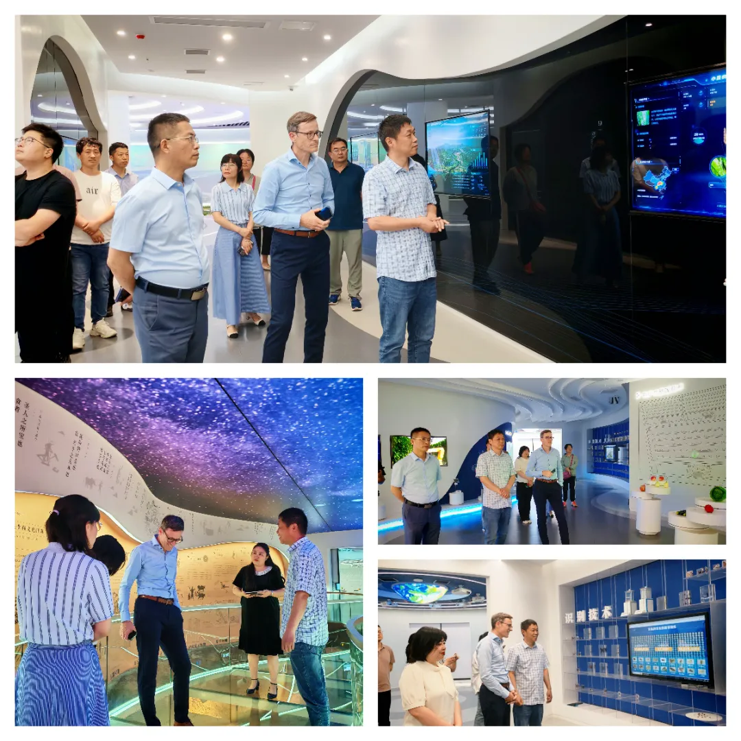 参观伊始,来访嘉宾一行首先走进豫见农业数字科技馆,系统了解了河南农业发展的历史变迁与数字化进程。在讲解人员的引导下,René Tönz 先生详细了解了云飞科技在智慧植保、农业信息化等方面的应用实践与创新成果,并对中国智慧农业的发展速度与落地规模表示赞叹。