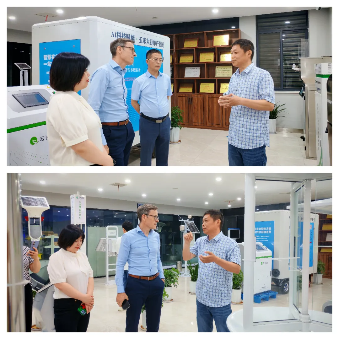在随后的考察中,René Tönz 一行深入云飞科技的生产制造基地,参观了虫情测报、农业气象、水肥灌溉、绿色防控等一系列智能化农业装备,并现场观看了AI识虫系统与物联网平台的功能演示。