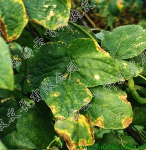 症状 主要为害叶片,也为害茎和果。叶片受害,从叶尖和边缘开始,初为暗绿色水渍状小斑,随病情发展病斑扩大成不规则形的褐色坏死斑,病斑周围有黄色晕圈,病部变硬,薄而透明,易脆裂。叶片干枯如火烧状,故又称叶烧。嫩叶受害,皱缩、变形,易脱落。茎蔓染病,初为水渍状,发展成褐色凹陷条斑,环绕茎一周后,致病部以上枯死。果实染病,初为褐红色、稍凹陷的近圆形斑,严重时豆荚内种子亦出现黄褐色凹陷病斑。在潮湿条件下,叶、茎、果病部及种子脐部,均有黄色菌脓溢出。