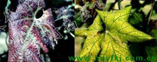 症状春季的症状较不明显,病株比健株矮小,萌发迟。在非灌溉区的葡萄园,叶片的症状始见于6月初,而灌溉区迟至8月份。红色品种在基部叶片的叶脉间先出现淡红色斑点,夏季斑点扩大、愈合,致使脉间变成淡红色,到秋季,基部病叶变成暗红色,仅叶脉仍为绿色。白色品种的叶片不变红,只是脉间稍有褪绿。病叶除变色外,叶变厚、变脆,叶缘下卷。