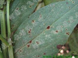 防治方法 要采用综合防治法才能收到较好的效果。(1)适时播种,防止冬前发病,减少病原基数,生育后期避过锈病盛发期。(2)选用早熟品种,在锈病大发生前收获或接近成熟时收获。(3)合理密植,开沟排水,及时整枝,降低田间湿度。(4)不种夏播蚕豆或早蚕豆,减少冬春菌源;冬播时清水洗种也可减轻发病。(5)发病初期开始喷洒30%固体石硫合剂150倍液或15%三陛酮可湿性粉剂1000—1500倍液、50%萎锈灵乳油800倍液、50%硫磺悬浮剂200倍液、25%敌力脱乳油3000倍液、25%敌力脱乳油4000倍液加15%三唆酮可湿性粉剂2000倍液,隔川天左右1次,连续防治2—3次。