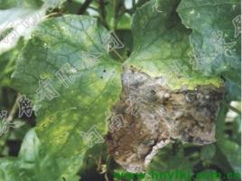 丝瓜蔓枯病主要为害茎蔓,也可为害叶片和果实。茎蔓上病斑椭圆形或梭形,灰褐色,边缘褐色,有时病部溢出琥珀色胶质物,最终致茎蔓枯死。叶片发病,病斑较大,圆形,叶边缘呈半圆形或“V”字型,褐色或黑褐色,微具轮纹,病斑常破裂。果实病斑近圆形或不规则形,边缘褐色,中部灰白色。病斑下面果肉多呈黑色干腐状。