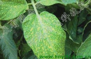 缺氮植株生长缓慢,全株叶色黄绿色,早衰,初期老叶黄绿色,后变浅绿色,小叶细小,直立。缺磷初叶背也显紫红色,叶片上出现褐点,叶片僵硬,叶脉变紫色,叶尖变黑褐色枯死。缺钾发病前或发病初期叶缘出现针尖大小黑褐色点,后茎部也出现黑褐色斑点,根系发育不良,幼果易脱落或畸形果多。缺硼叶片褪绿或变橘红色,生长点发暗或变黑,叶片易落,根系发育不良变褐色,易产生畸形果,果皮上现褐色斑点。缺铁植株顶部叶片失绿后呈黄色。缺锰中部叶片或老叶呈浅绿色,后幼叶失绿,叶片上出现网状纹,脉间失绿也呈浅黄色。缺镁在第l个花房膨大期植株下部老叶出现失绿,叶脉间出现模糊的黄化现象,后向上部叶扩展,形成黄花斑叶;严重的叶片略僵硬或边缘上卷,叶脉间出现坏死斑或在叶脉间形成褐色块带,致使叶片干枯或整叶至全株黄化。缺硫叶色呈淡绿向上卷曲,后心叶枯死或结果少,严重的变为浅黄色。缺钙植株瘦弱下垂,发病前或发病初期心叶边缘发黄皱缩,严重时心叶枯死,植株中部叶片形成大块黑褐色斑,后全株叶片上卷。