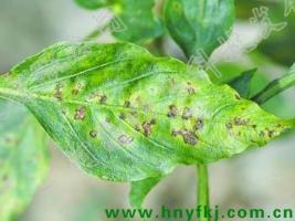 ⑶药剂防治。发病初期喷药,常用农药有72%农用硫酸链霉素可溶性粉剂 4 000倍液,47%加瑞农可湿性粉剂 600倍液,60%琥•乙膦铝可湿性粉剂 500倍液,新植霉素4 000~5000倍液,14%络氨铜水剂300倍液。每隔7~10天防治1次,共防治2~3次。