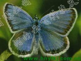 【形态特征】成虫体长9—1lmm,翅展25—30mm。雌雄异形。雄虫翅正面青蓝色,具青色闪光,黑色缘带宽,缘毛白色且长;前翅前缘多白色鳞片,后翅具1列黑色圆点与外缘带混合。雌虫翅棕褐色,前、后翅亚外缘的黑色斑镶有橙色新月斑,反面灰白色。前、后翅具3列黑斑,外列圆形与中列新月形斑点平行,中间夹有橙红色带,内列斑点圆形,排列不整齐,第2室1个,圆形,显著内移,与中室端长形斑上下对应,后翅基部另具黑点4个,排成直线;黑色圆斑外围具白色环。卵扁圆形,初黄绿色,后变黄白色。幼虫头黑褐色,月同部绿色,背线色深,两侧具黄边,气门上线色深,气门线白色。老熟幼虫体背面具2列黑斑。蛹长椭圆形,淡黄绿色,羽化前灰黑色,无长毛及斑纹。