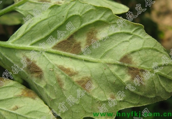 症状:主要危害叶片,严重时也危害茎、花和果实,叶片发病,初期叶片正面出现黄绿色、边缘不明显的斑点,叶背面出现灰白色霉层,后霉层变为淡褐至深褐色;湿度大时,叶片表面病斑也可长出霉层。病害常由下部叶片先发病,逐渐向上蔓延,发病严重时霉层布满叶背,叶片卷曲,整株叶片呈黄褐色干枯。嫩茎和果柄上也可产生相似的病斑,花器发病易脱落。果实发病,果蒂附近或果面上形成黑色圆形或不规则斑块,硬化凹陷,不能食用。