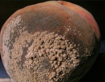 (3)、果实受害:果实自幼果至成熟期都可受害,以近成熟期受害最重。最初在果面产生褐色圆形病斑,如环境适宜,数日内病班扩至全果,果肉变褐软腐,继而病斑表面产生灰褐色绒状霉丛,即病菌的分生孢子梗和分生孢子。孢子丛常呈同心轮纹状排列。病果腐烂后易脱落,但不少失水后形成僵果而挂于树上,经久不落。僵果是一个假菌核,是病菌越冬的重要场所。该病还危害杏、李、樱桃等核果类果树。