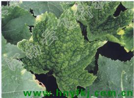症状:多全株发病。苗期染病子叶变黄枯萎,幼叶现浓绿与淡绿相间花叶状。成株染病新叶呈黄绿相嵌状花叶,病叶小略皱缩,严重的叶反卷,病株下部叶片逐渐黄枯。瓜条染病,表现深绿与浅绿相间疣状斑块,果面凹凸不平或畸形,发病重的节间短缩,簇生小叶,不结瓜,致萎缩枯死。