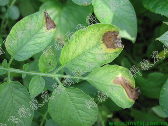 叶片染病先在叶尖或叶缘生水浸状绿褐色斑点,病斑周围具浅绿色晕圈,湿度大时病斑迅速扩大,呈褐色,并产生一圈白霉,即孢囊梗和孢子囊,尤以叶背最为明显;干燥时病斑变褐干枯,质脆易裂,不见白霉,且扩展速度减慢。茎部或叶柄染病现褐色条斑。发病严重的叶片萎垂、卷缩,终致全株黑腐,全田一片枯焦,散发出腐败气味。块茎染病初生褐色或紫褐色大块病斑,稍凹陷,病部皮下薯肉亦呈褐色,慢慢向四周扩大或烂掉。