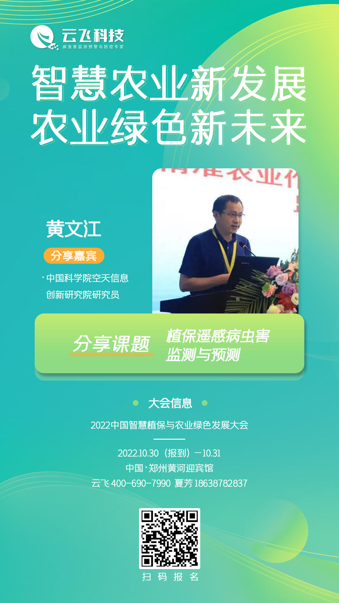 本次大会,黄文江将莅临现场并分享《植保遥感病虫害监测与预测》课题,云飞科技与您相约郑州,共话智慧农业新发展,遇见农业绿色新未来。
