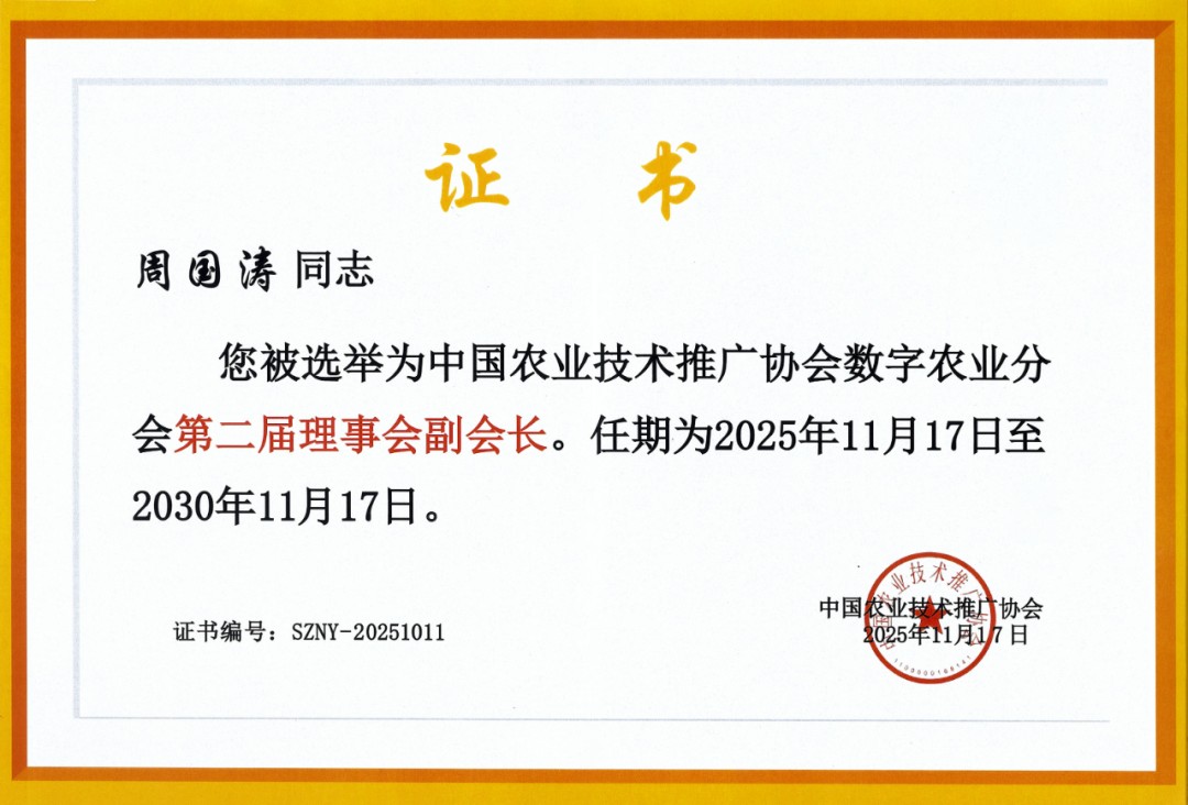 会议选举环节,选举产生了数字农业分会第二届理事会,河南云飞科技发展有限公司被选为中国农业技术推广协会数字农业分会副会长单位,云飞科技创始人周国涛被选为中国农业技术推广协会数字农业分会第二届理事会副会长。