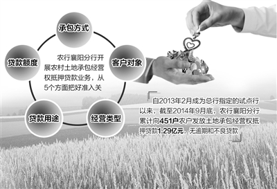 “通过确权颁证破除贷款申请上的障碍,通过抵押登记则破除贷款审批上的障碍。”农行襄阳分行农户金融部总经理骆华表示。数据显示,自2013年2月成为总行指定的试点行以来,截至2014年9月底,农行襄阳分行累计向451户农户发放土地承包经营权抵押贷款1.29亿元,没有发生逾期和不良贷款。