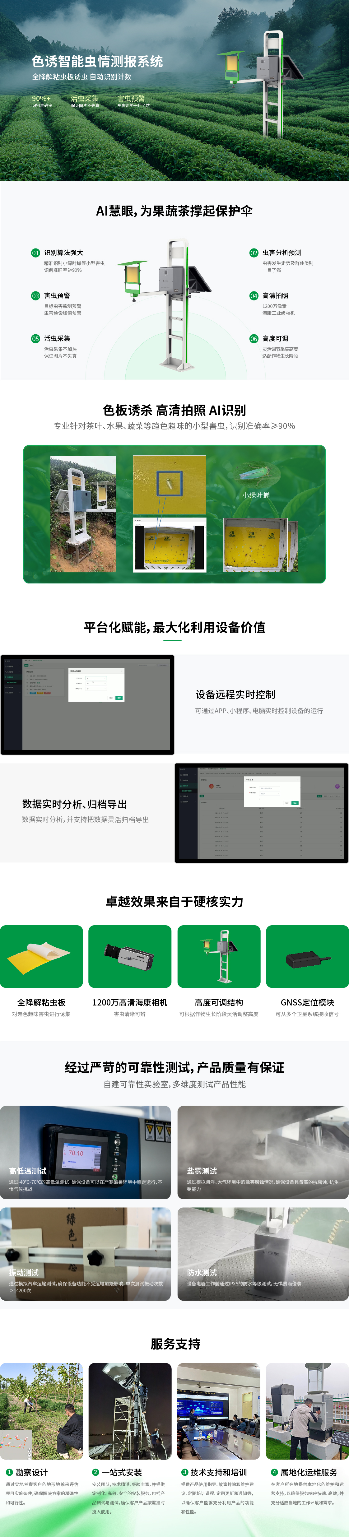 色诱测报系统通过全降解粘虫板进行色诱捕虫,它是一款集远程控制、自动诱集害虫、定时采集害虫照片、数据传输、数据统计、数据分析于一体的测报系统。在平台上可以实现对害虫的自动识别计数,对害虫发生于发展进行分析和预警,为后续用药防治提供可靠的依据,助力虫害绿色防控。